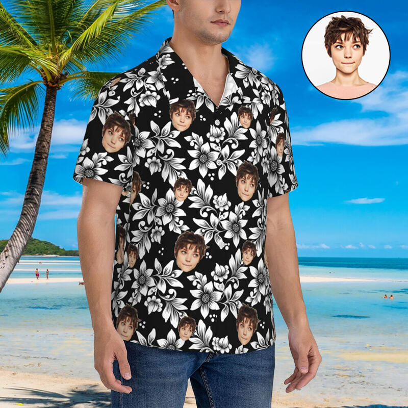 Camicia hawaiana personalizzata Top nero bianco floreale Aggiungi foto viso per uomo