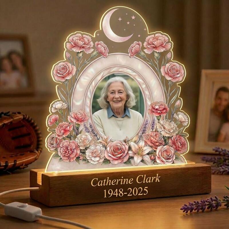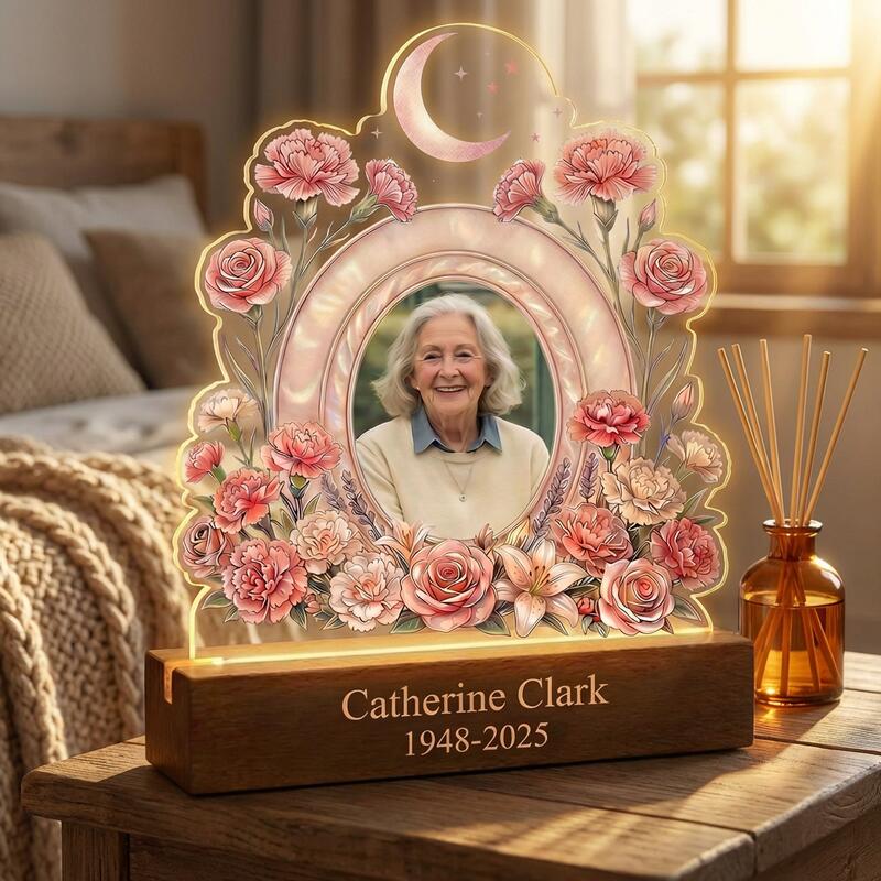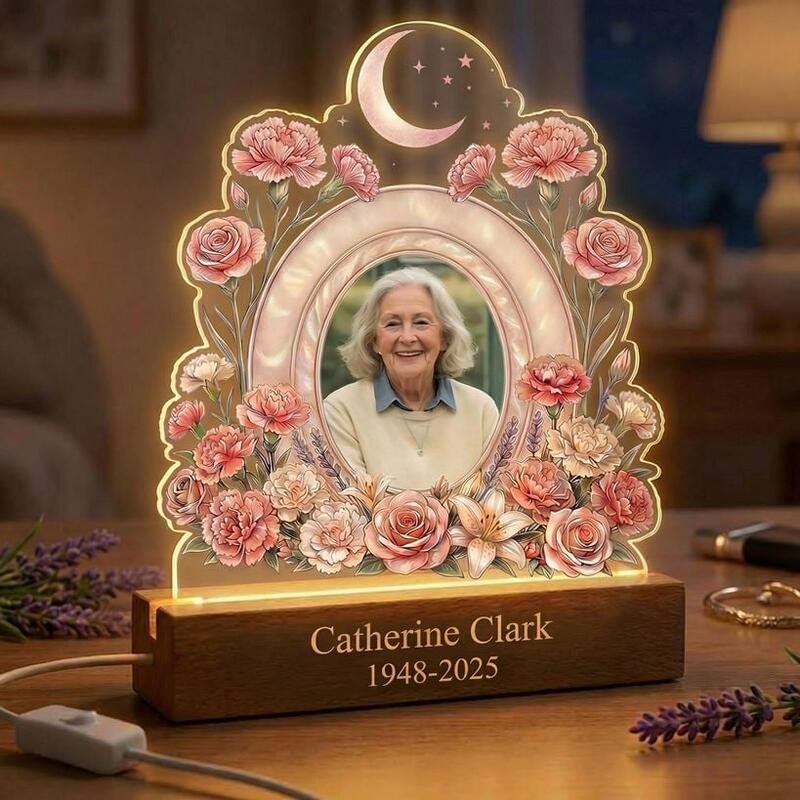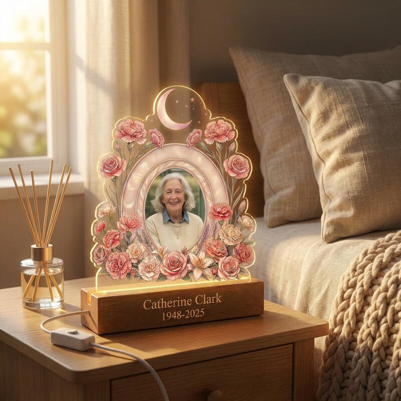 Luce notturna personalizzata con foto della luna e composizione floreale regalo di condoglianze per la perdita di una persona cara
