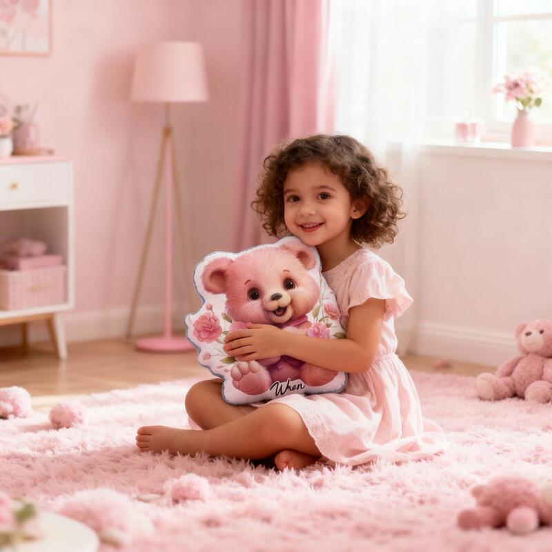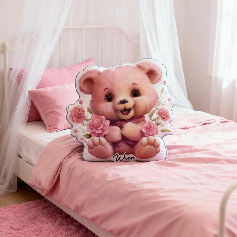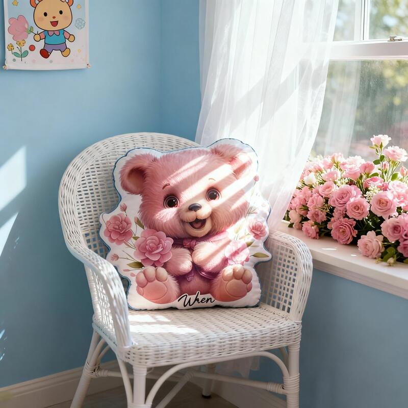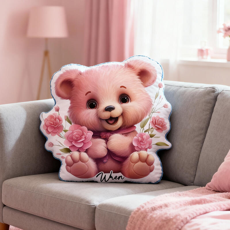 Cuscino personalizzato con orsacchiotto rosa con nome aggiunto e disegno floreale per San Valentino