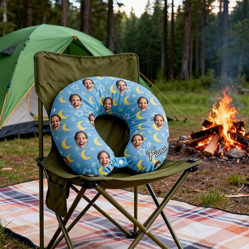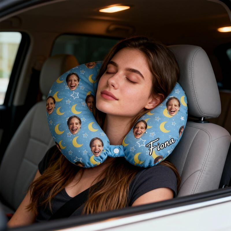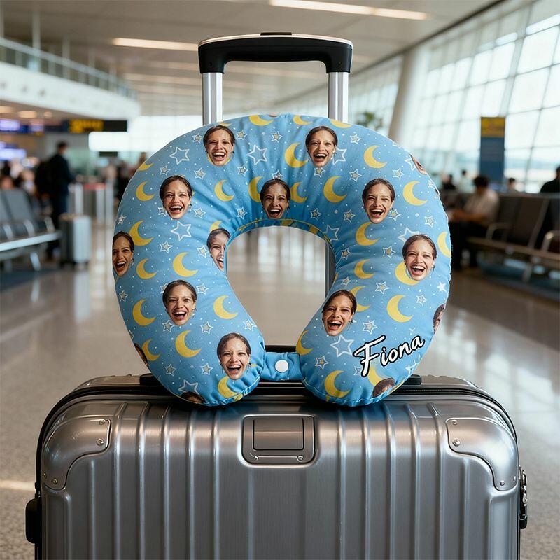 Cuscino personalizzato a forma di U per il collo Foto personalizzata Design con stelle blu e luna Regalo da viaggio per gli amici