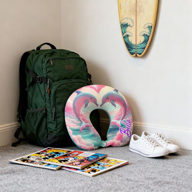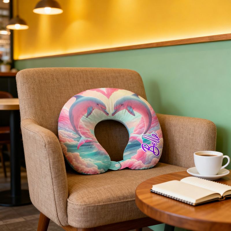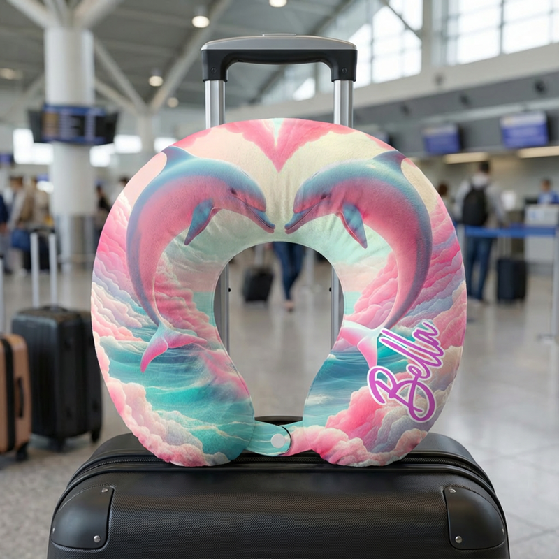 Cuscino personalizzato a forma di U con disegno di nuvole rosa cielo e cuori con delfini regalo da sogno per lei