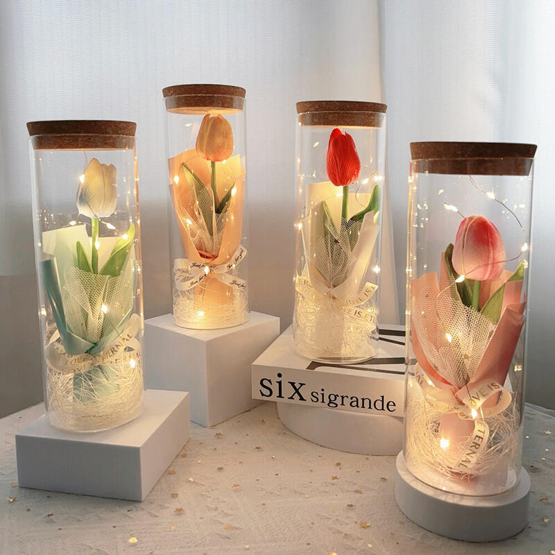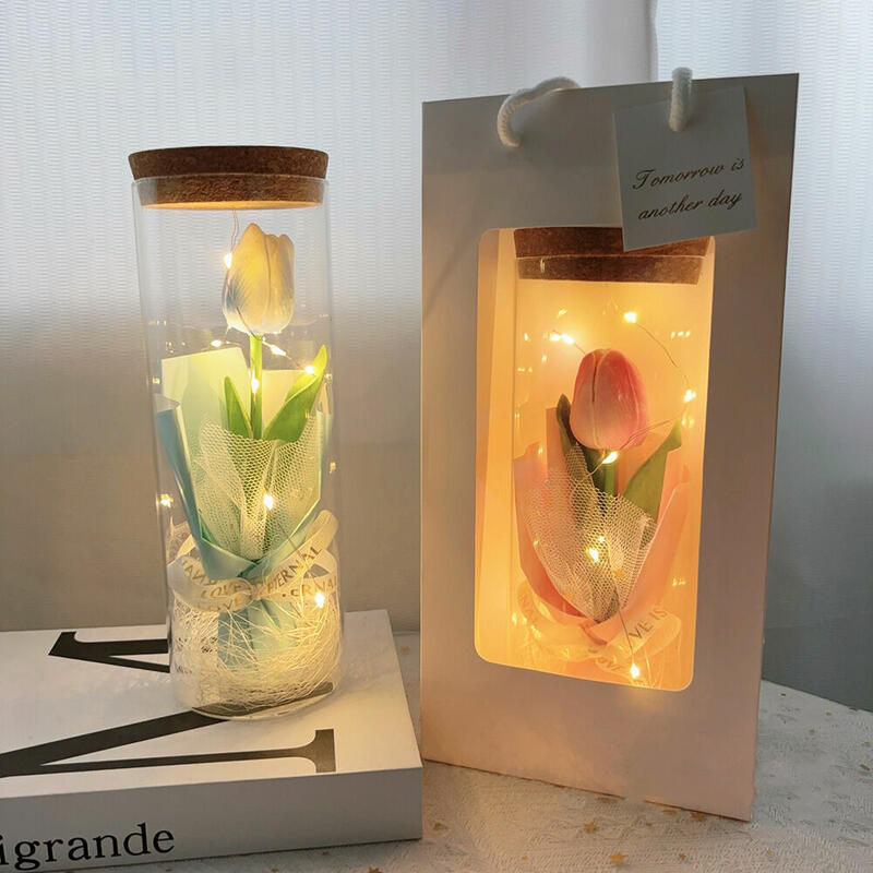 Bouquet di tulipani in bottiglia di vetro luce notturna regalo romantico per San Valentino